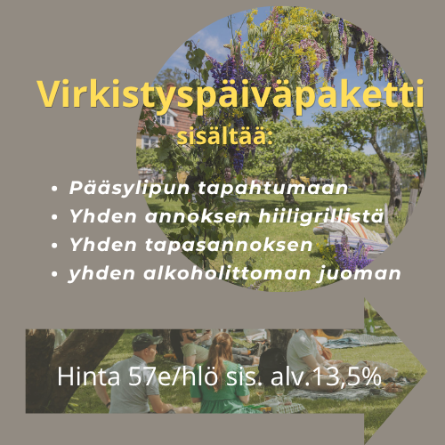 Voit ostaa verkkokaupasta halutessasi lisäksi juomalipukkeita ( a´6e) tai vaikka Piknikin Omenapuun alla (a´30e/hlö) . Lisätietoa piknikistä löydät vierittämällä sivua alaspäin. Huomioi kun olet valinnut Virkistyspaketit ostoskoriin ja painanut jatka , kauppa ehdottaa sinulle juomalippuja ja piknikkoreja lisäostoiksi, joten saat kaikki kerralla samaan pakettiin eikä sinun tarvitse ostaa niitä tältä sivulta erikseen. Voit myös ostaa paketteja laskutuksella. Ota yhteyttä info@tammiston.com. Vastaamme myös mielellämme kysymyksiin puhelimitse 044-5104293