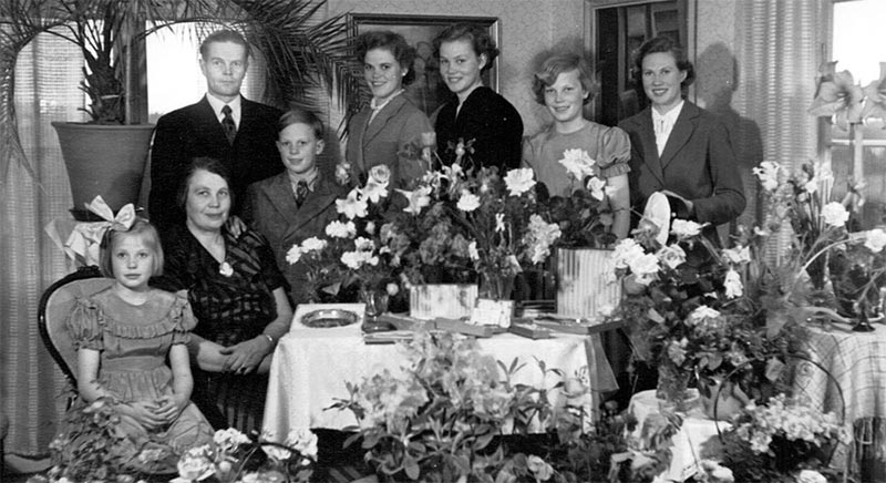 Uuno ja Lyyli Nieminen perheineen. Uunon vieressä Antti Nieminen, tilan seuraava isäntä. Nykyinen emäntä on Antin tytär.